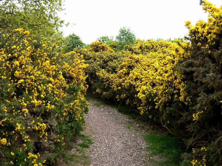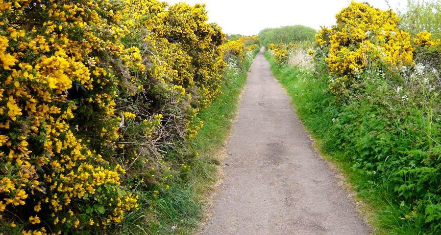 Ето го градчето отдалече, с водната кула стърчаща вляво. Ярките жълти храсти са едно интересно растение, което цъфти няколко пъти в годината и в края на зимата е първото, което "оцветява" пейзажа.