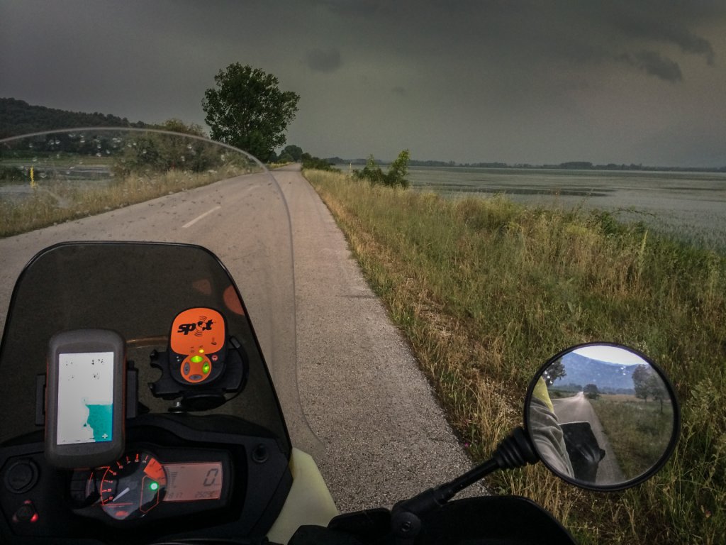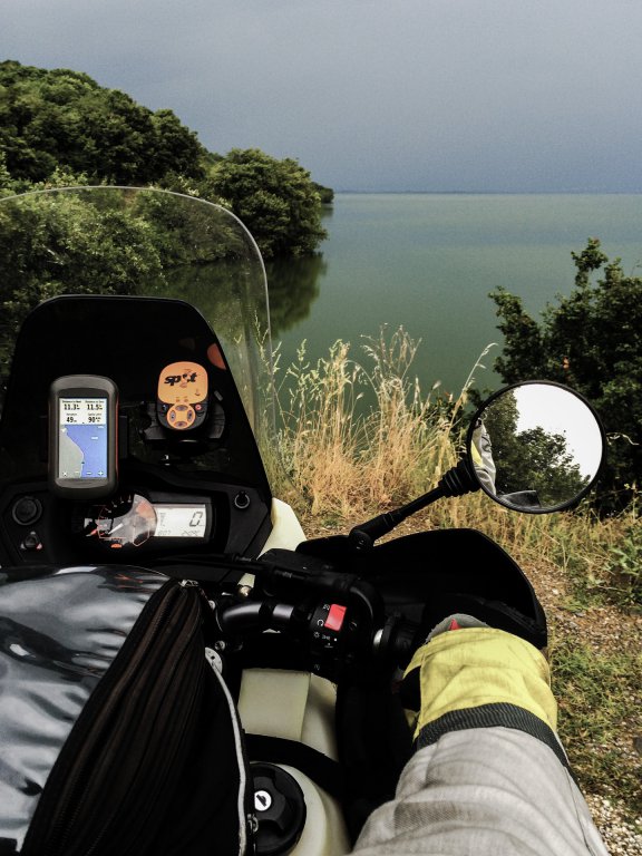 сметнахме, че е крайно време да си сложим дъждобраните. Тъкмо ги облякохме, и дойде Бурята! Качихме се на мотора, но едновременно ни заблъскаха ураган, дъжд и градушка. Лошото беше, че сме на тесен път, от двете страни на който имаше само вода. Езерото ни бе заобиколило и бурята ни хвана на възможно най-неподходящото място! Опитахме да продължим на ход, но се оказа невъзможно. Слезнахме от мотора. /така си мислех, в последствие се стана ясно, че така бързо ни е треснал ураганът, че Събин не е успял да слезе/. Събин с едната ръка държеше мотора, а с другата мен. Вятърът ме подмяташе като носна кърпа. Умирах от ужас да не захвърли мотора и Събин във водата. Стоях с глава към бурята под ъгъл 45 градуса и се държах, за да не излетя и аз към водата. На всеки 3 секунди силата на бурята ставаше х2. Ескалираше бурно и ние на практика не знаехме кога и дали ще спре. Впрегнахме всичките си сили да се задържим на тесния път и никой и нищо да не излети във водата. Градушката бясно тряскаше по каската ми и смътно чувах Събин как ми крещеше в комуникацията да си прикрия ръцете, за да не ми изпочупи пръстите. Беше нещо невиждано от мен до сега.. След известно време, не знам колко, вятърът понамаля. Събин извика да се качвам на мотора и се махнахме от това място. Двайсет метра по-надолу по пътя намерихме беседка и се „скрихме” там.