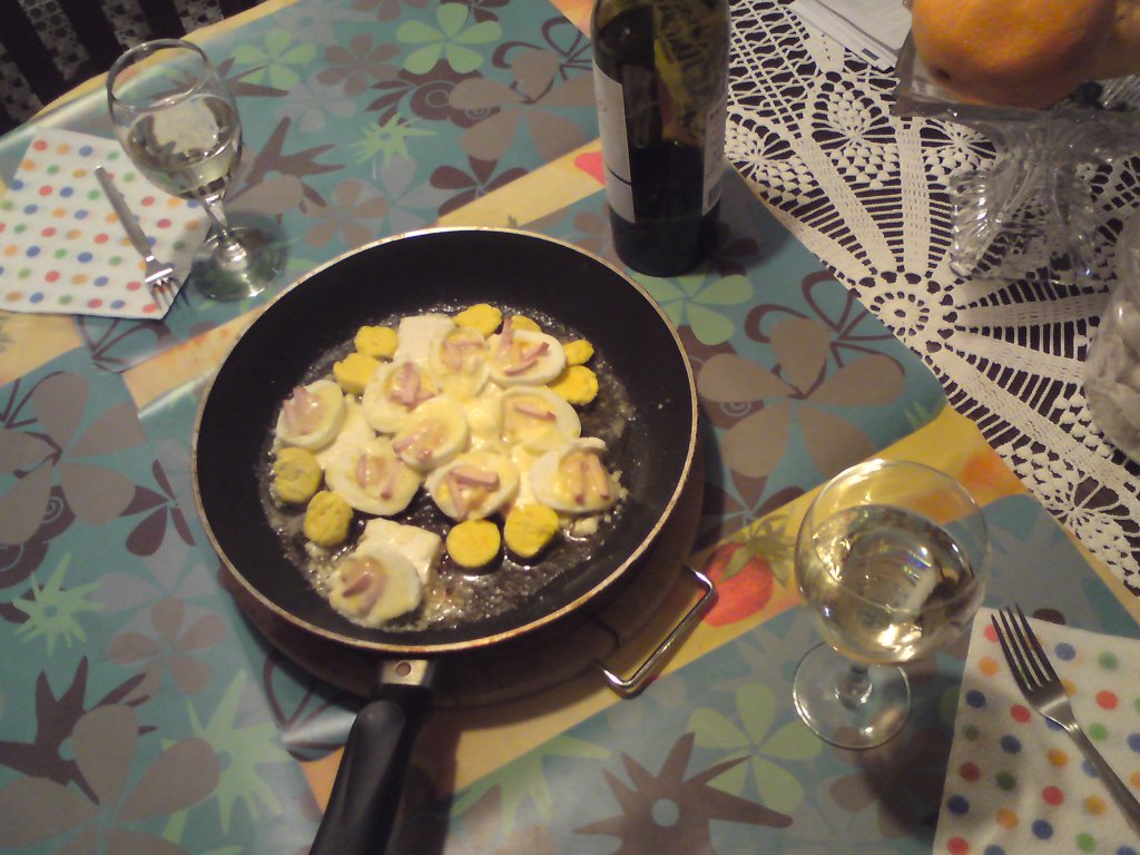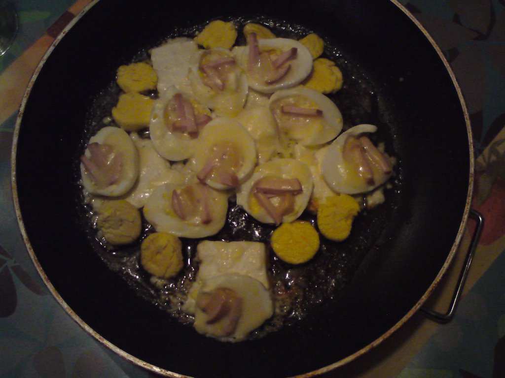 . В тигана с не залепващо покритие сипвате малко зехтин и отгоре шахматно нареждате сирене на плочки. Желателно е сиренето да е твърдо. Докато подготвяте яйцата, включете котлона да загрява. В белтъците слагате по няколко грама майонеза и по едно малко парченце топено сирене, желателно да е по засукано - с чушка и/или с билки, а защо не и с гъби. Аз използвах с чушка. Следва да вместите в белтъка и някаква шунка на миниатюрни лентички, или пък кренвирш обработен по същият начин. Количествата са повече от минимални. Наредете яйцата в/у сиренето, отстрани уплътнете мозайката с жълтъците и отгоре поръсете с настърган кашкавал, като ръсите предимно в/у белтъците. Котлона вече е загрят, така че похлупете тигана с някакъв капак и мятайте на печката, като не пропуснете да намалите котлона на половина. След няколко минути, може би около пет, кашкавала се е разтопил и в тигана има и малко образувала се течност. Сега е момента да отхлупите тигана, да увеличите отново котлона и да позапържите всичко, докато течността се изпари. Готово! Точно навреме, тъкмо се прибра и половинката