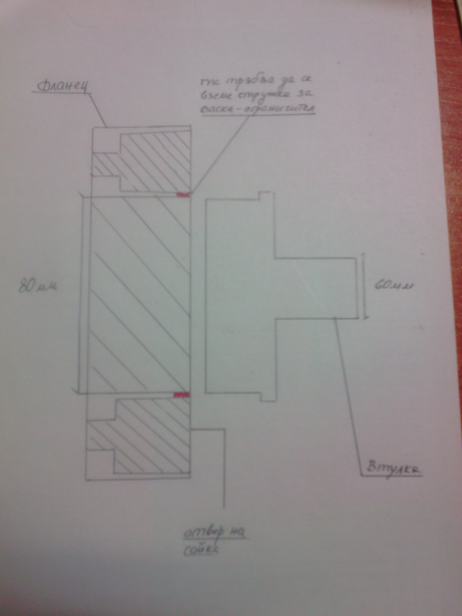 Проблема е, че стругаря каза, че ако не се направи някакъв ограничител на втулката, тя може да се движи аксиално по остта на главината, но при опита да направи такъв се сблъскваме, с прекалено големия диаматър, който е изтънил растоянието на фаските на гайките, то е всъщност 1.5 мм. Идеята беше там да се вземе една стружка, да се направи фаска и втулката да легне в нея. Ама няма място, прекалено силно е било желанието да се създаде фланец, който да може да се слага максимален брой коли.