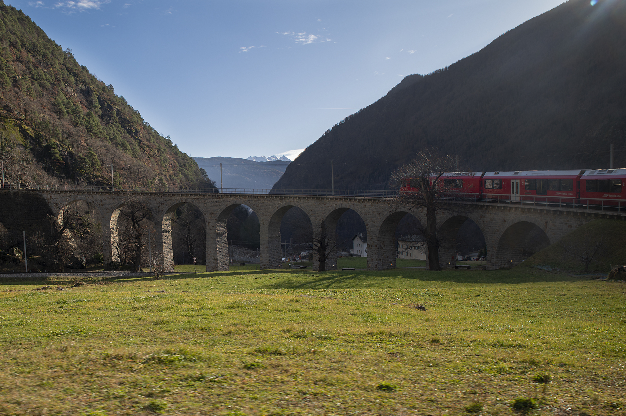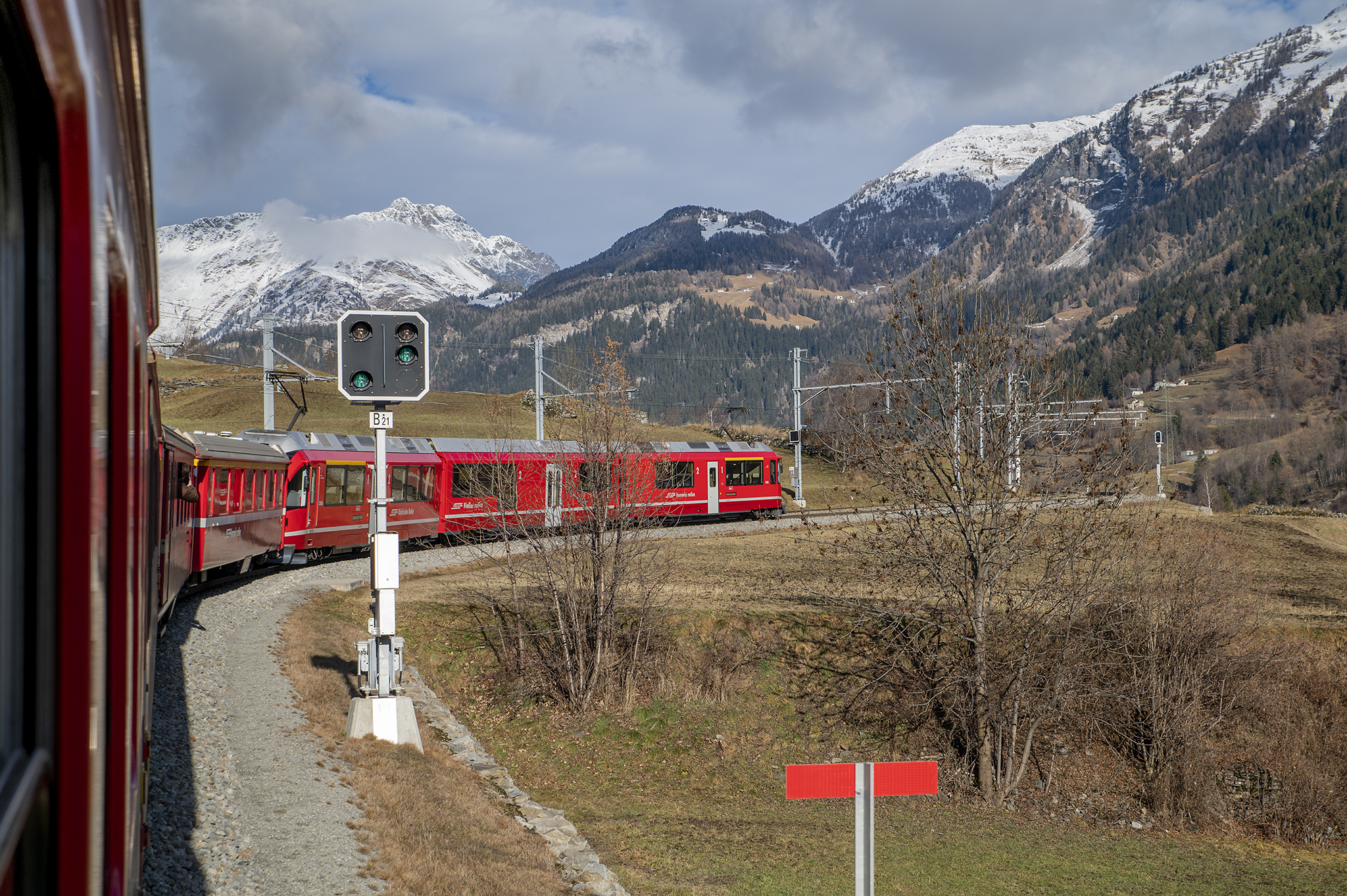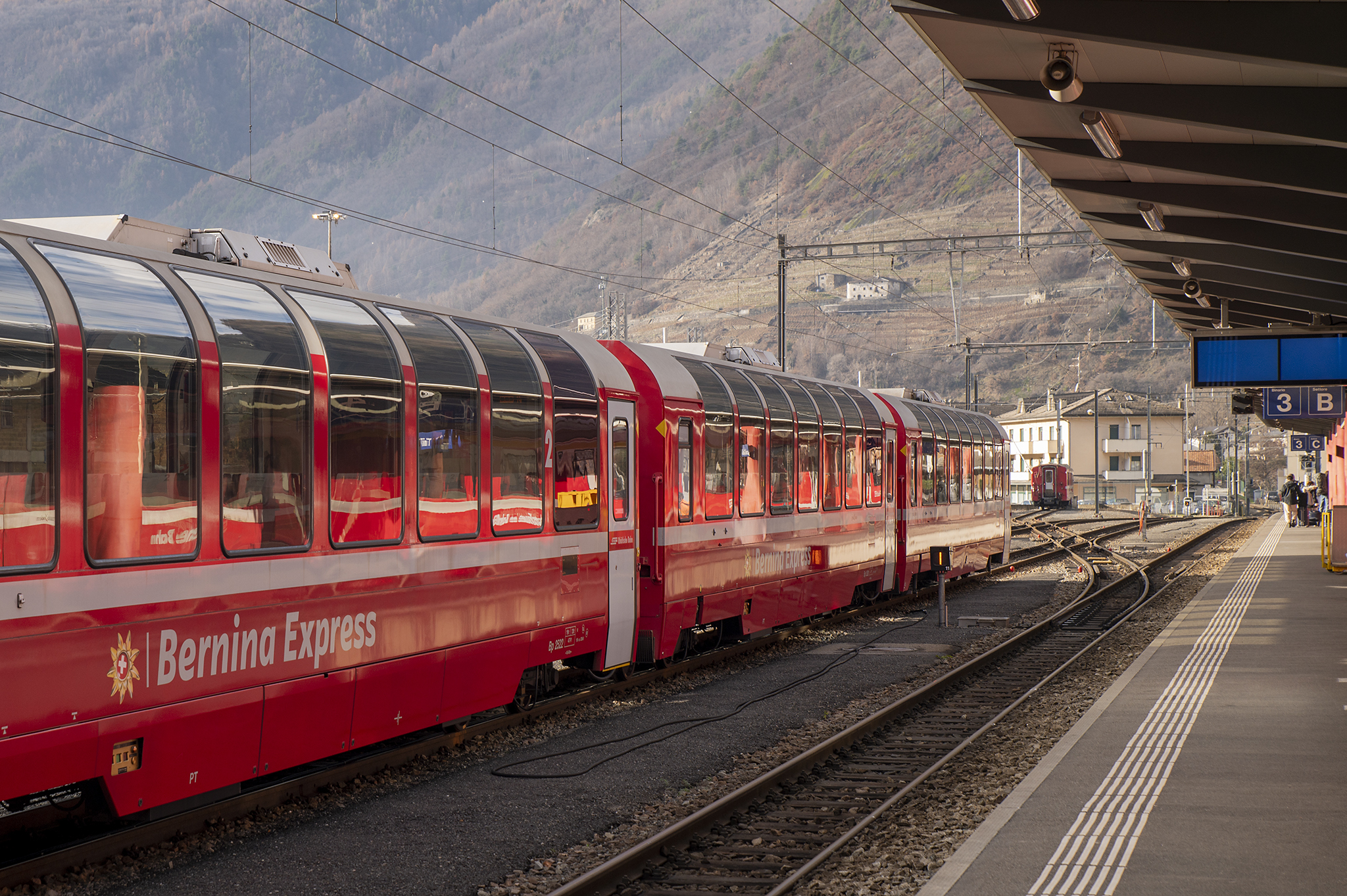 Една разходка с влак, която много ми хареса и я препоръчвам на всеки. Влака се хваща от Тирано (Tirano) до Сен Мориц (St. Moritz) и е известен под името Bernina Express, който е с панорамни не свалящи се прозорци, и задължително със запазени седящи места. За него билетите са малко скъпи и трябва да са взети по от рано. Има два - три курса на ден, в конкретен час. Алтернативата обаче е регионалния влак, който се движи по същия маршрут и е на всеки час. Не се запазват места, прозорците се свалят, а парното във влака е доста силно.